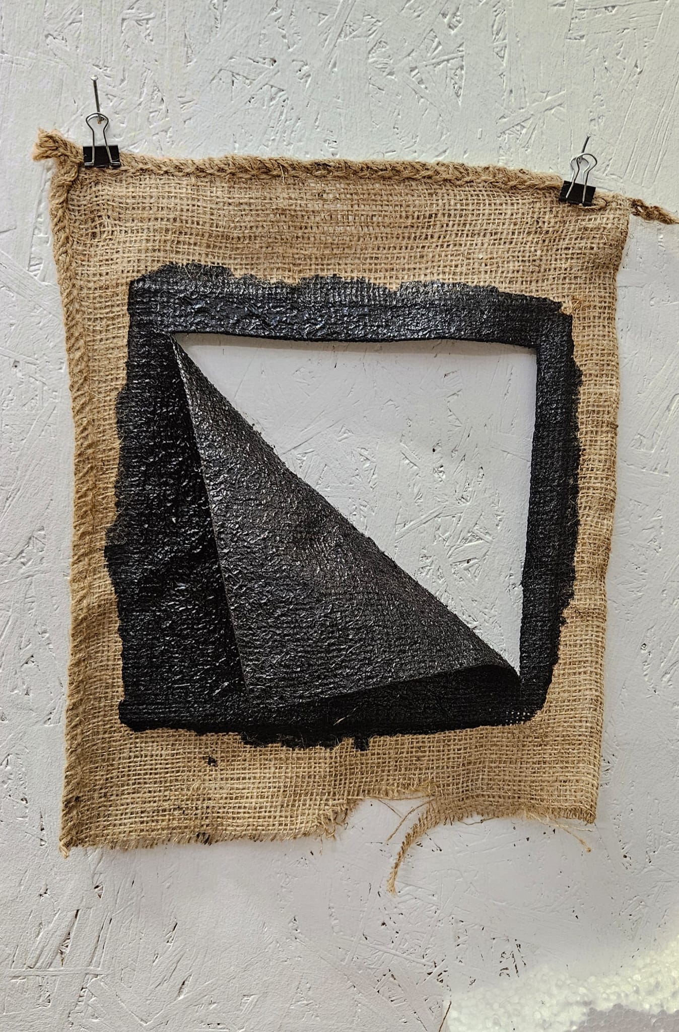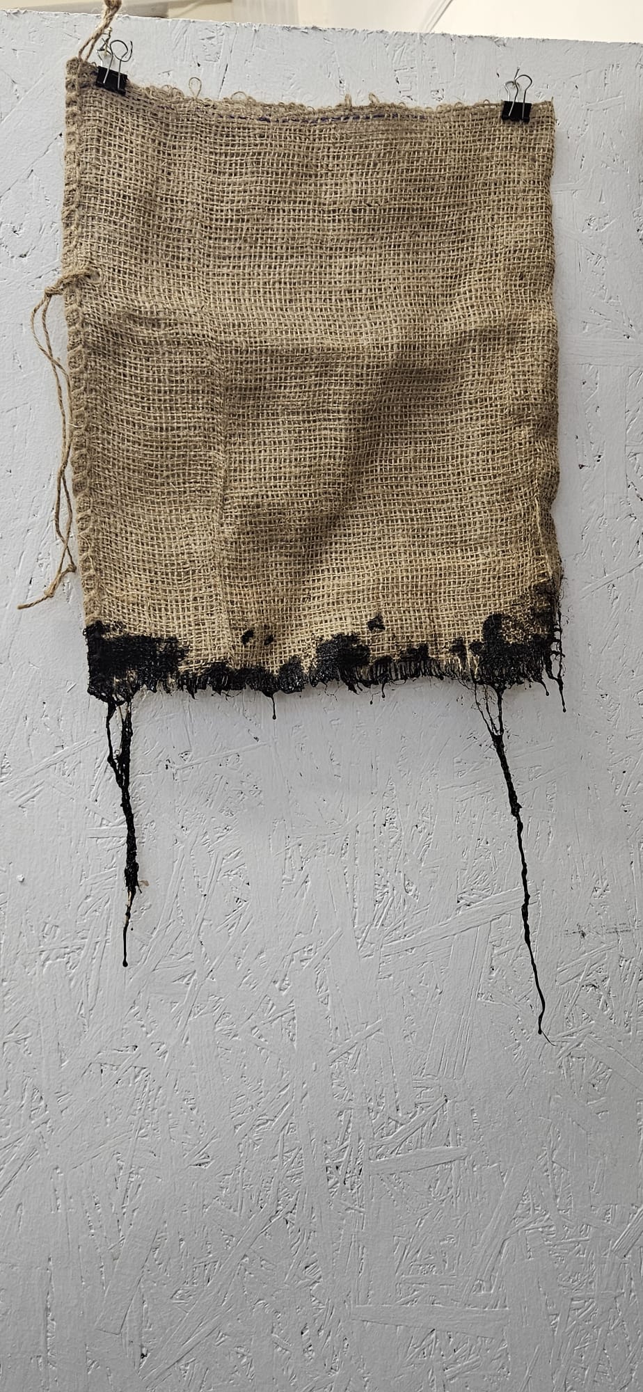 This project uses materials that blur the distinction between natural and manmade: bitumen (fossilised remains), sackcloth (coarse spun fibre), wood ash (the burning of a tree), and rust (the oxidation of iron). The pieces are designed to produce visceral reactions – to something broken/wrong/ruined; tactile and tangible.